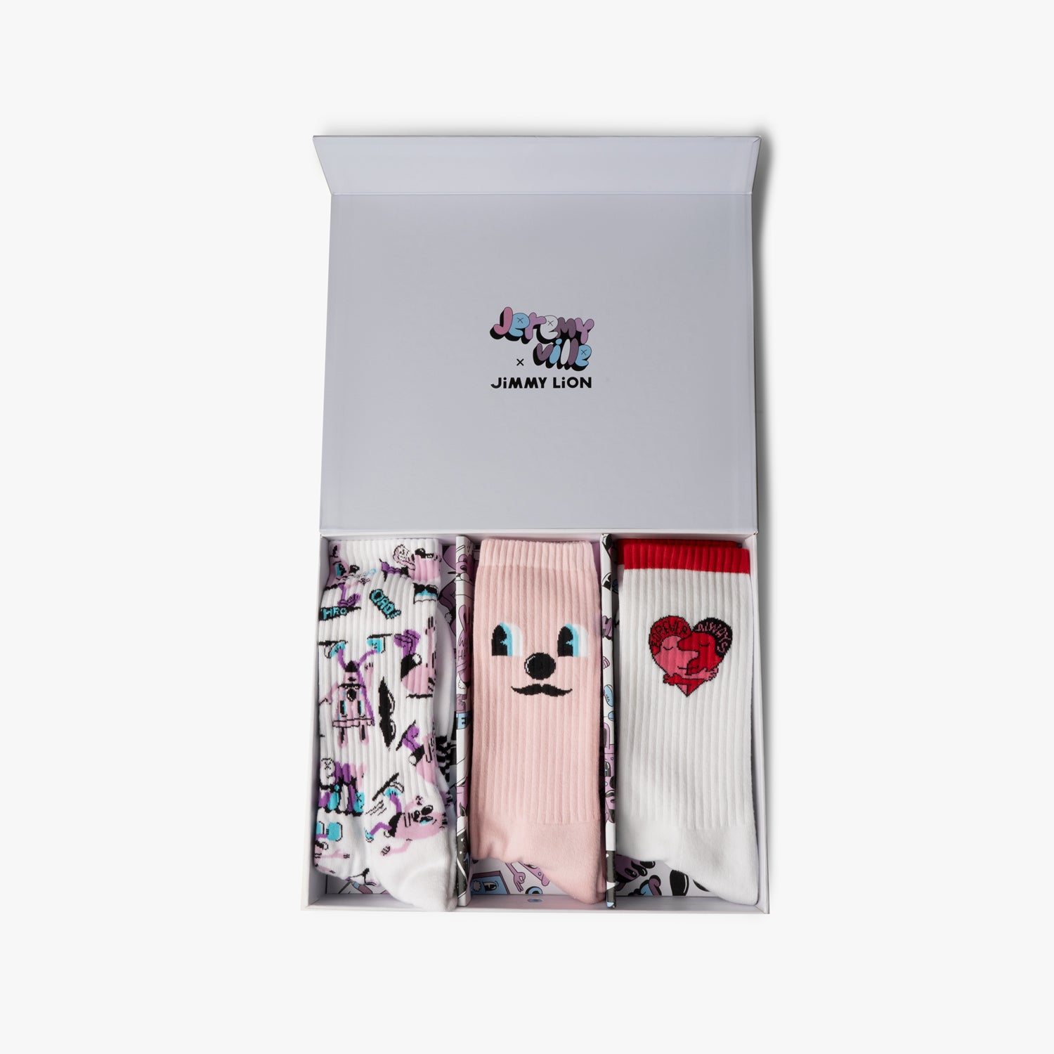 Algunos de las ilustraciones más populares del artista Jeremyville se unen en un pack regalo muy especial que trasmitirá positividad y buen rollo. Con estampados románticos y colores pastel, esta selección de calcetines dará a tus looks un toque original lleno de autenticidad.